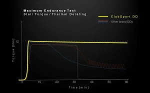 Many mass-market direct drive systems fail to hold their claimed torque figures, gradually derating (reducing motor performance) over time to avoid overheating. The ClubSport DD’s efficient motor and thermally-optimised layout holds a genuine 12 Nm torque even in the most extreme conditions, for example running an endurance race at maximum force feedback settings.
