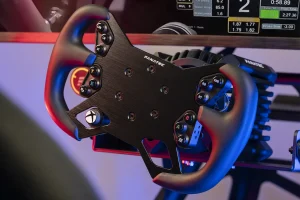 The 318 mm Wheel Rim features overmolded rubber grips similar to the Podium Steering Wheel BMW M4 GT3, ensuring comfort and a consistent feel during long races.