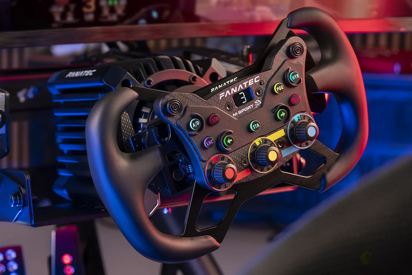 The 318 mm Wheel Rim features overmolded rubber grips similar to the Podium Steering Wheel BMW M4 GT3, ensuring comfort and a consistent feel during long races.
